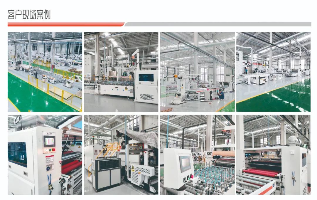 可片材、可卷材混合生產(chǎn)。通用PET、PETG、PP、PVC、CPL、防火板、亞克力、鋁箔、SPC等飾面材,利用PUR膠水均勻平貼到板材表面。