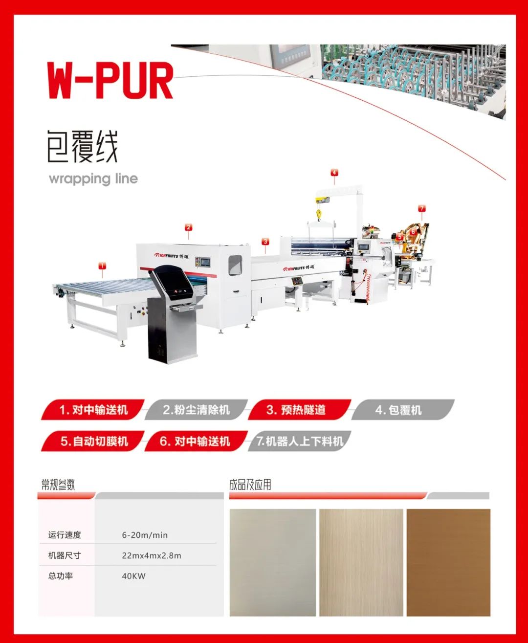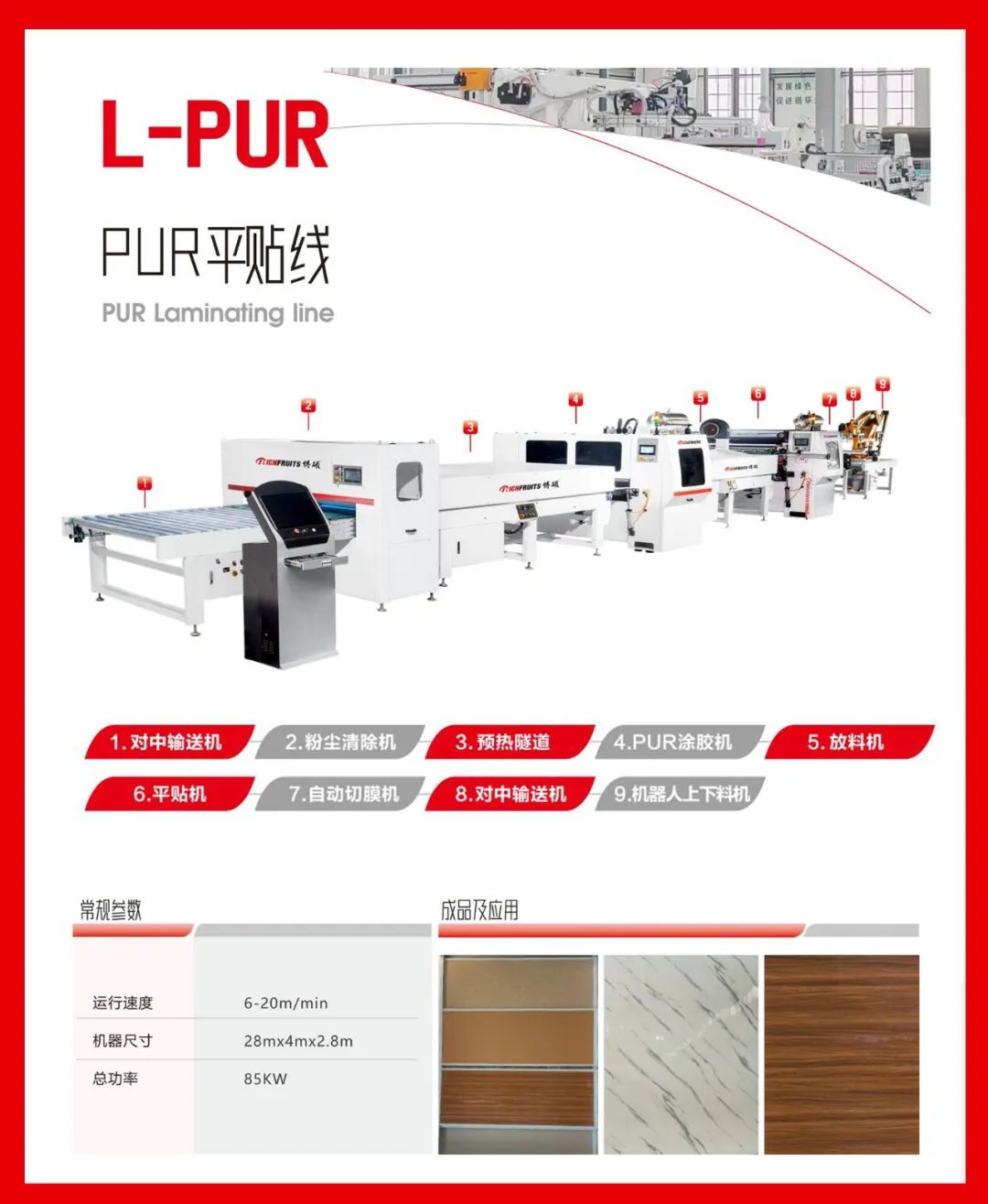 可片材、可卷材混合生產(chǎn)。通用PET、PETG、PP、PVC、CPL、防火板、亞克力、鋁箔、SPC等飾面材,利用PUR膠水均勻平貼或包覆到板材表面。 通用于包覆種類的產(chǎn)品,比如:硅酸板、水泥纖維板、門芯板多層墻板等材料進行PUR膠水涂布后包覆各種柔性貼材。