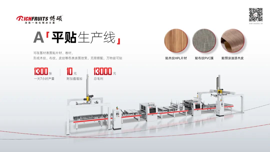 A線:平貼生產線,這工藝相對簡單且投資門檻較低的一條產線,可在基材表面貼上各種膜或片材,做成千種效果,甚至貼上預涂好油漆的木皮,總之萬物皆可貼;別看我說他工藝簡單,但是產量可不簡單,一天7小時產量是1300張48尺板,增加飾面效果后的每張板附加值增加10元, 那么一天毛利是13000元;當然這個是我們估算的理想狀態下的數據,作為參考。