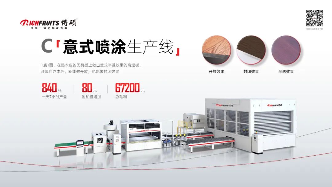 C線:在貼木皮的無機板上通過噴涂的方式做出意式半透效果的高定板,能夠還原自然本色,既能做開放,也能做封閉效果。這條線的最大特點:一鍵換色,一分鐘完成噴槍清洗,柔性化程度高,高定和批量工程都能通用。一天7小時產量是840張48尺板,每塊板的毛利大概是80元, 一天毛利是67200元。