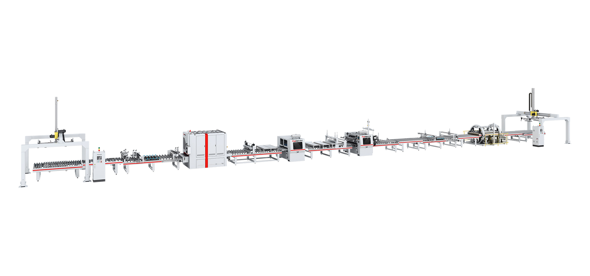 本生產線由:龍門上下料機 — 對中輸送機 — 輸送機 — 倒角機 — 砂光機 — 粉塵清除機 — PUR涂膠機(含溶膠系統) — 恒溫隧道 — 平貼機 — 斜切機 — 輸送機 — 精密修邊機 — 輸送機 — 圓筒式翻板機 — 輸送機 — 對中輸送機 — 龍門上下料機等部分組成。