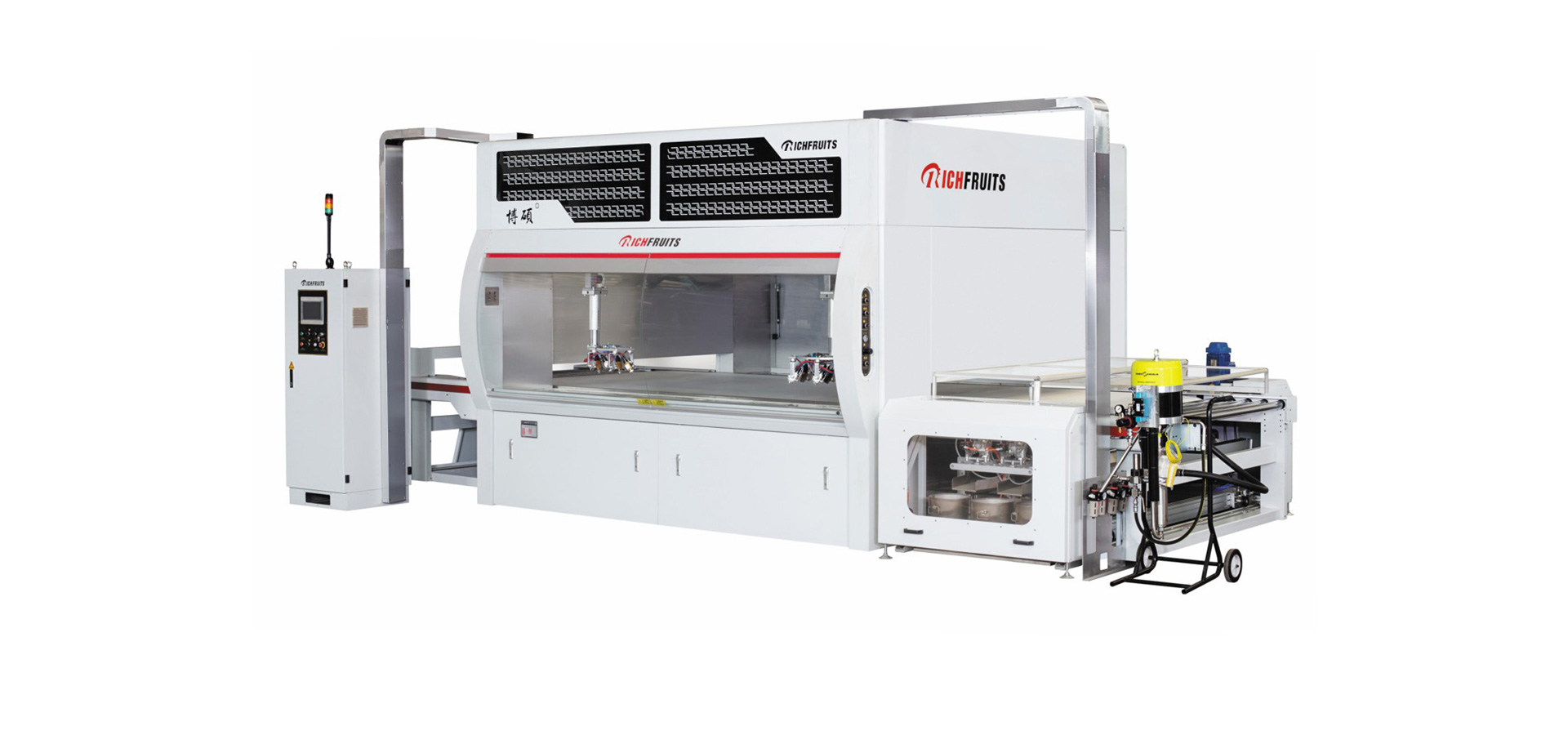 適用于實木家具、實木復合門、美式櫥柜、套房家具、衛浴柜、展示柜、工藝品等板式工件的平面和四個側邊,針對UV、PU、AC、NC和水性漆等,進行高質量效果連續自動噴漆,實現節能、環保和減少人工,提高產品質量和生產效率。