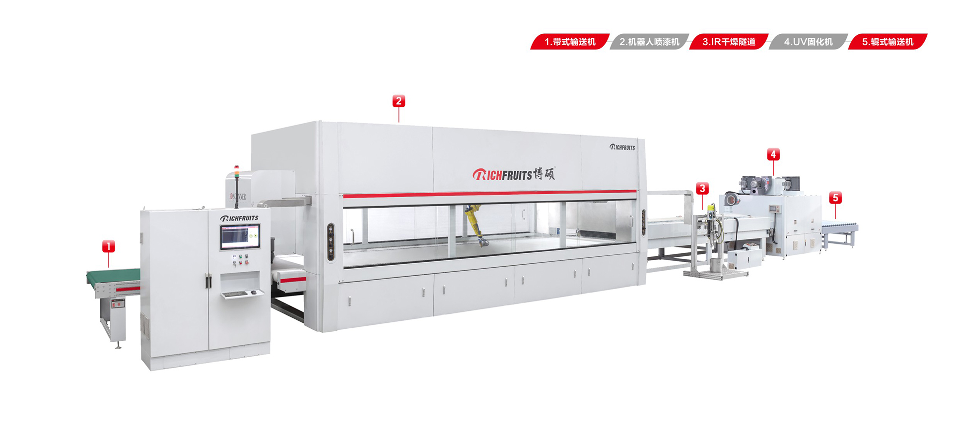 適用于板式家具、實木門、櫥柜門、工藝品、裝飾板、硅酸鈣板、玻鎂板、水泥纖維板的板式加工件的平面和四個側邊進行高質量、大批量連續噴漆。