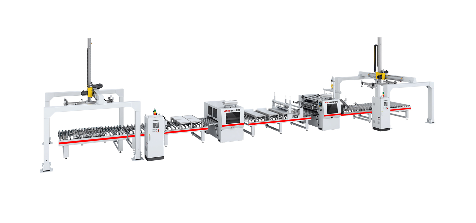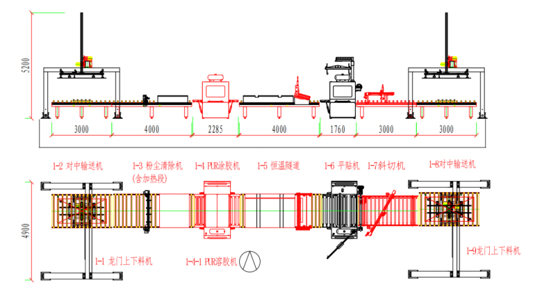 本生產線由:龍門上下料機 — 對中輸送機 — 粉塵清除機 — PUR涂膠機 — 恒溫隧道 — PUR平貼機 — 斜切機 — 對中輸送機 — 龍門上下料機等部分組成。