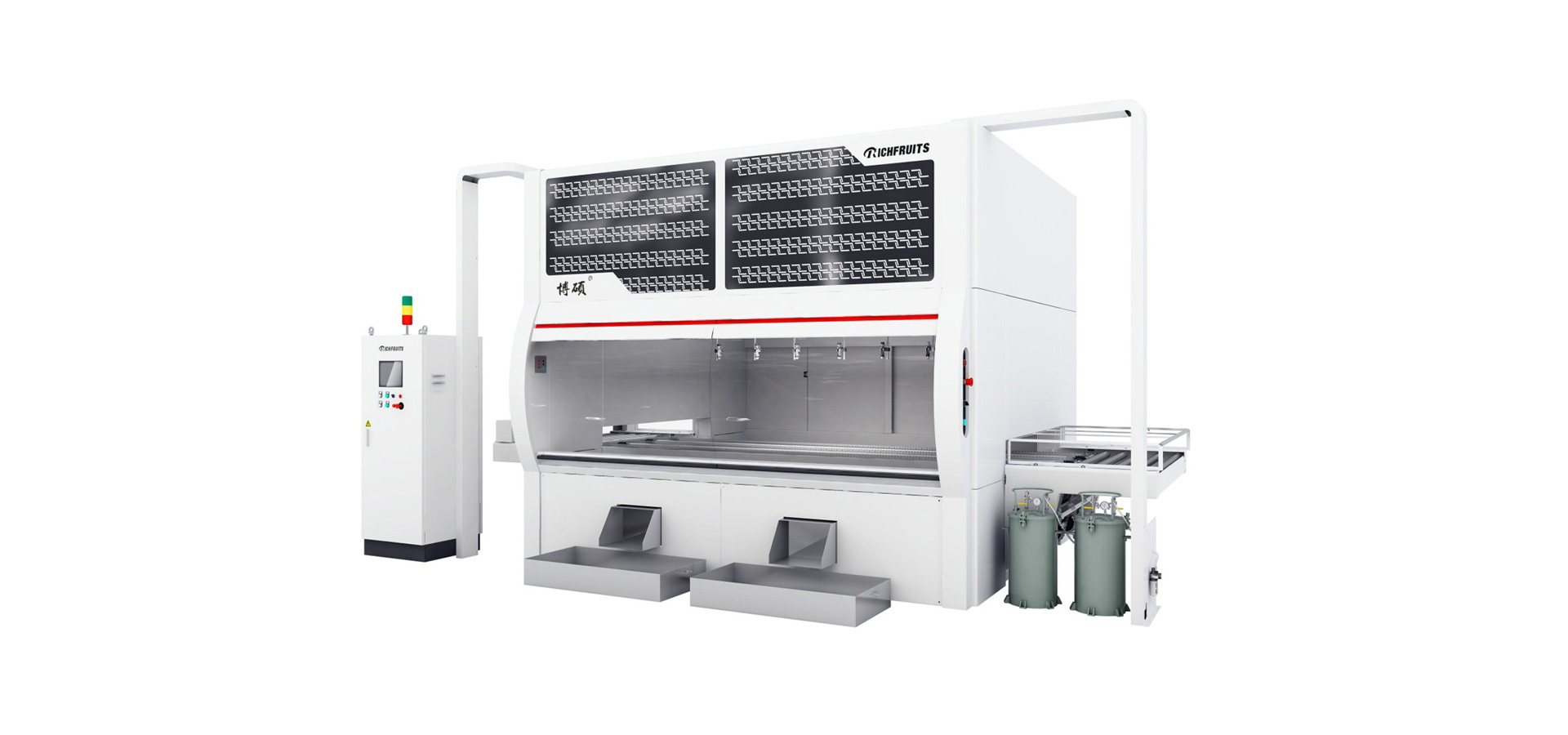 寬體雙臂自動噴涂室:鏈條輸送方式,變頻調(diào)速;一字噴槍排布;配光電掃描,控制噴槍的啟停動作。平整垂直的噴涂室,貼防護膜更容易。